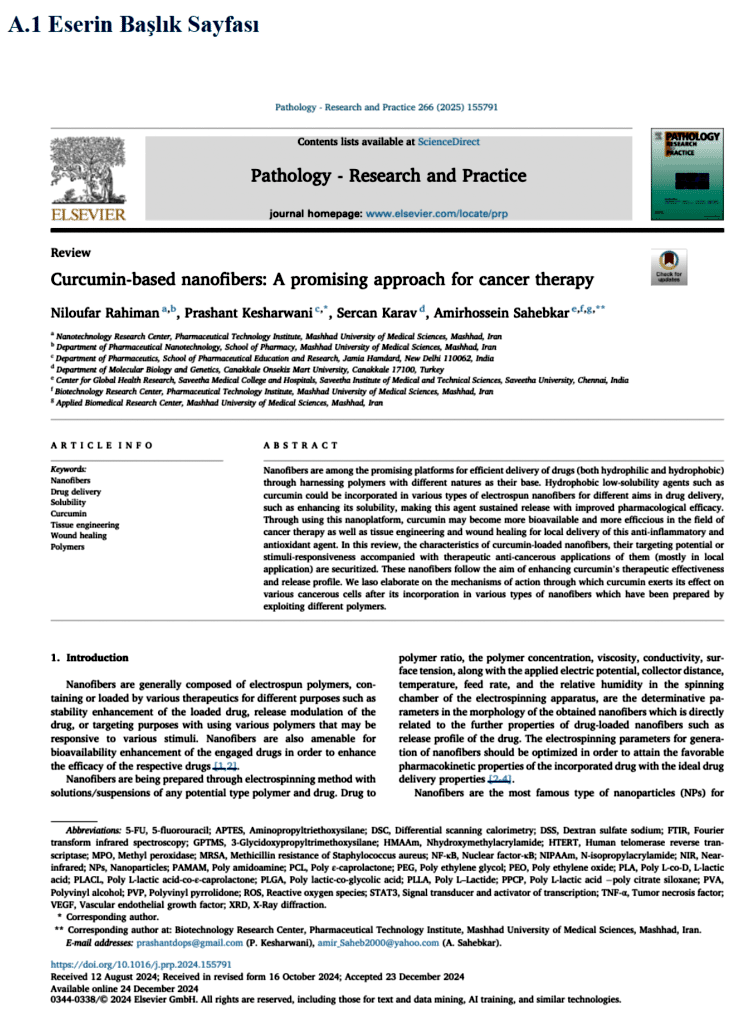 Yeni doçentlik atıf şablonunda yer alan “eserin başlık sayfası” atıf yapan eserin ilk sayfasıdır. Bu sayfada başlık, yazarlar, özet ve geliş-kabul-yayın tarihi gibi bilgiler yer almaktadır.Örnekleri aşağıda verilecektir.
